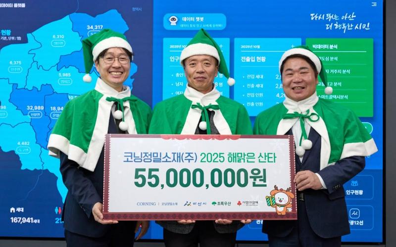 아산시(시장 오세현)는 17일 코닝정밀소재(주)(대표이사 사장 반 홀)가 초록우산 충남지역본부(본부장 김우현)와 함께 아산시를 방문해 ‘2025 해맑은 산타’ 사업 후원금으로 총 5,500만 원을 전달했다고 밝혔다.